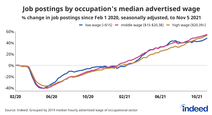 “But since the delta surge in late summer, low advertised wage job postings started to lag middle and high advertised wage job postings, with a current spread of more than five percentage points,” she added.